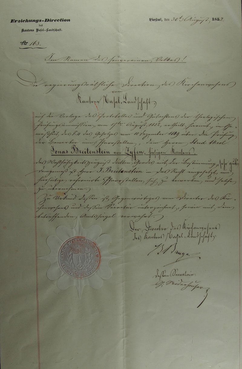 | Erziehungs-Direction des Kantons Basel-Landschaft | Liestal, den 2t. October 1851. |