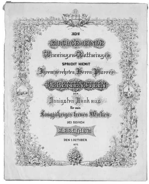 - Sämtliche Kirchenbücher / Tauf- Confirmations- Sterbe- Trauungsregister, welche von 1604 bis und mit 6. Oct. 1870 fortgeführt, ferner zwei Familienbücher von 1853 bis u. mit 6. Oct. 1870, 1 Weisungenbuch und zwei leere Kirchenbücher, zusammen 18 Bände, endlich ein Familienbuch von 1800–1852 und zwei Exemplare Agenden
