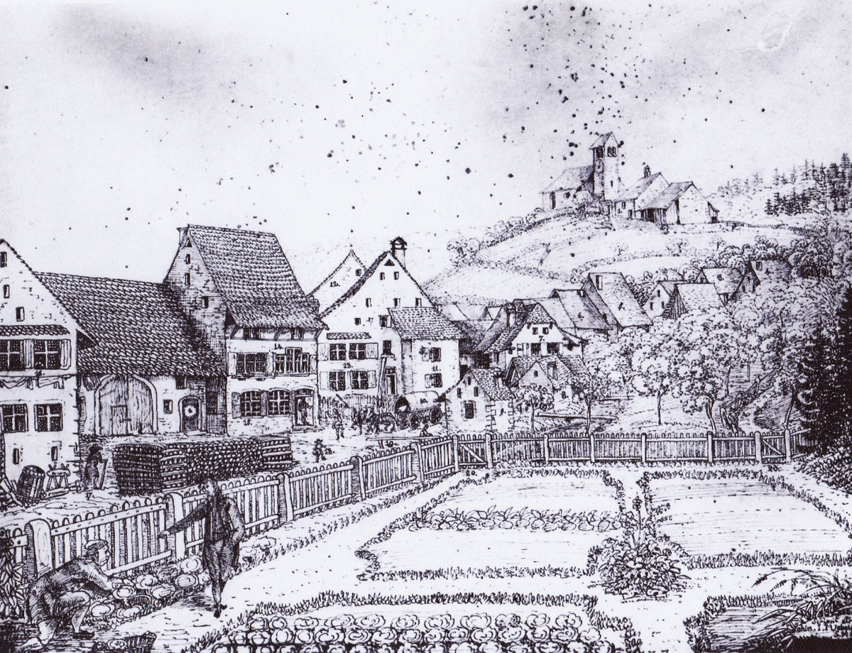 Eine Beschreibung des Dorfes aus der ersten Hälfte des 19. Jahrhunderts lieferte der damalige junge Pfarrer Johannes Linder (1790–1853). Dieser kommentierte eine Rötelzeichnung von J. J. Uebelin, welche er am 7. November 1815 seiner Braut Anna Katharina Merian nach Basel sandte. Die im Gedicht erwähnten Zahlen verweisen auf die Zeichnung.
